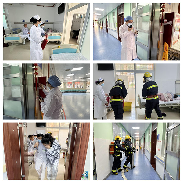 此次演练模拟内科住院部一楼发生火情。值班医生发现火情,马上按火警报警按钮,报告科主任,并拨打电话报告给应急管理值班员请求增援,值班员迅速到达现场并将现场情况上报指挥组,指挥组发出相关指令并组织疏散灭火,组织引导患者有序疏散至安全地点。当人员和患者疏散完毕后,消防站官兵使用消火栓,接驳水带进行灭火。