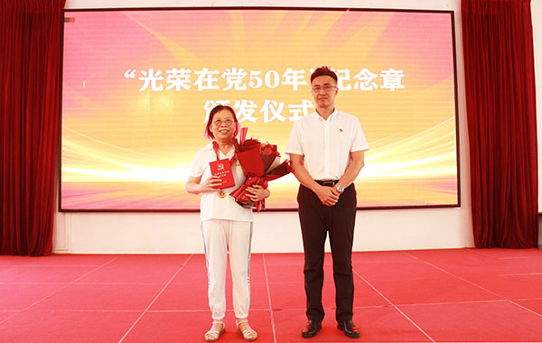 黄刚同志为“光荣在党50年”纪念章获得者黄旭东老党员颁发纪念章并献上鲜花,号召全体党员干部学习和弘扬老党员的政治品格和精神风范,勇于担当,锐意进取,为做爱自拍 高质量发展作出新贡献。